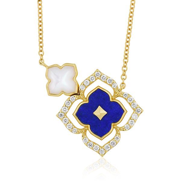 14K GOLD NECKLACE WITH FLOWER MOP, LAPIS FLOWER AND ROUND DIAMONDS